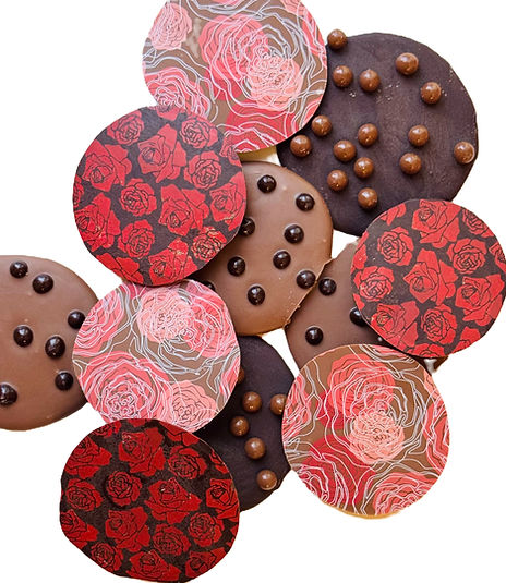Solid milk and dark chocolate disks, decorated with cocoa butter, garnished with crunchy pearls